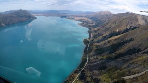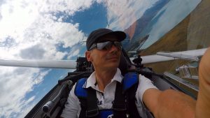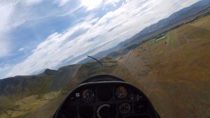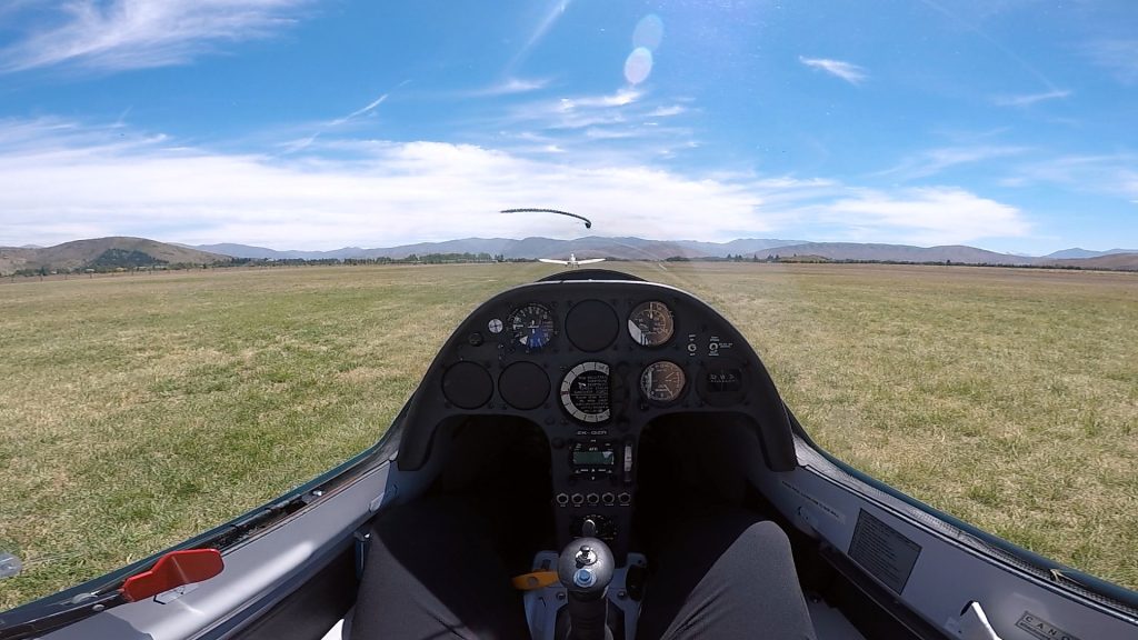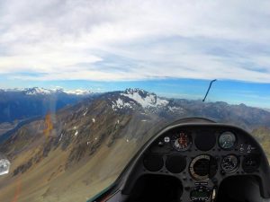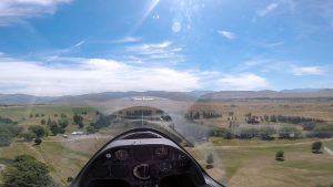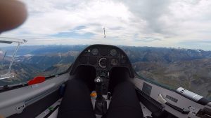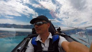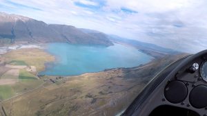 So zogen wir über den Lake Ohau, der uns etwas Aufwind bescherte. Aber dennoch nicht genug. 200m über dem Grund und die Basis noch 17 km entfernt. Also ein Lift muss her und wenn er noch so schwach ist. Da war einer mit 1m/sec und in endlosen Kreisen kamen wir wieder auf entsprechende Höhe. Wieder am gleiten sagte mir Norbert dann, ich sollte doch übernehmen! Ok, warum nicht. Steuerknüppel in die Hand und mit Gefühl den Glider geflogen. Was soll ich sagen… ein irres Gefühl. Rauf, runter, links, rechts und eine Runde übers Airfield. Jetzt könnte ich noch länger oben bleiben, wenn da nich das Thema mit der Höhe erreichen wäre. Nun war mir aber klar, warum Norbert noch etwas mehr Höhe erreichen wollte.