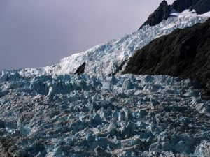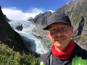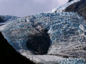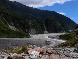 Am Nachmittag besuchte ich noch den Fox-Gletscher, der nur 30 min Fahrzeit entfernt liegt. Dort wanderte ich aber nur auf direktem Weg zum Gletschertor. Zumindest soweit man heran durfte. Hier viel mir der Gletscherschwund am deutlichsten auf, denn auch die Gletscher Neuseelands sind von der Globalen Erwärmung betroffen.