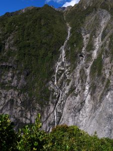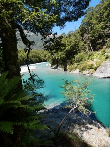Von Haast aus ging es dann immer am Haast-River hinauf zum Haast-Pass. Ein mächtiger Fluß in einem riesigen Flussbett aus Schotter. Langsam und stetig geht umgeben von einem Wahnsinns Panorama hoch zum Pass. Nur Wald, Berge, der Fluß und keinerlei Bewirtschaftung der Landschaft. Je höher man kam, je mehr übernahmen die Vögel wieder das Sagen im Wald. Zikaden waren nur noch wenige zu hören. Wasserfälle gab es reihenweise und sie sind schon fast nichts besonderes mehr. Es gibt sie überall.