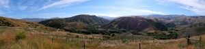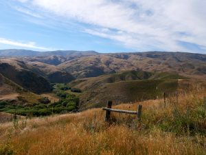 Gut ausgeschlafen und nach einem herrlichen Sonnenaufgang ging es dann los über den Lindis Pass an mein besagtes Ziel. Gebirgige Steppenlandschaft, endlos lange Straßen, gemäßigte Steigungen und bunte grüne Farbtupfer waren das Landschaftsbild. Wenn die grünen Tupfer der automatisiert bewässerten Felder der Farmer nicht währen, so könnte man meinen, man wäre im Hochland von Tibet unterwegs. Die Landschaft soll sich in den letzten Jahren verändert haben, so erzählten mir Einheimische. Immer mehr Flächen werden bewirtschaftet und müssen dazu zu mit riesigen Mengen an Wasser versorgt werden, denn an der Ostseite der Alpen gibt es kaum Niederschlag.
