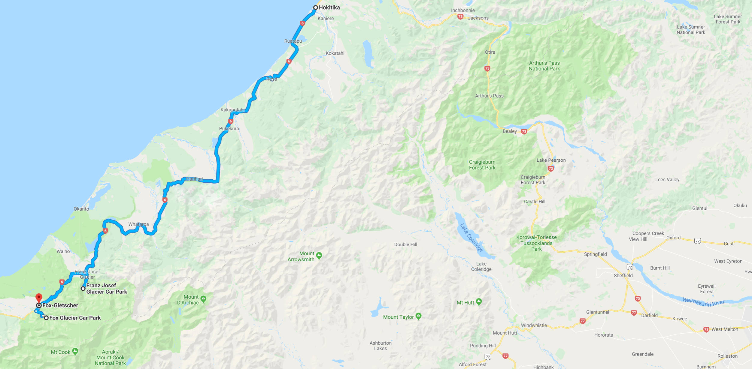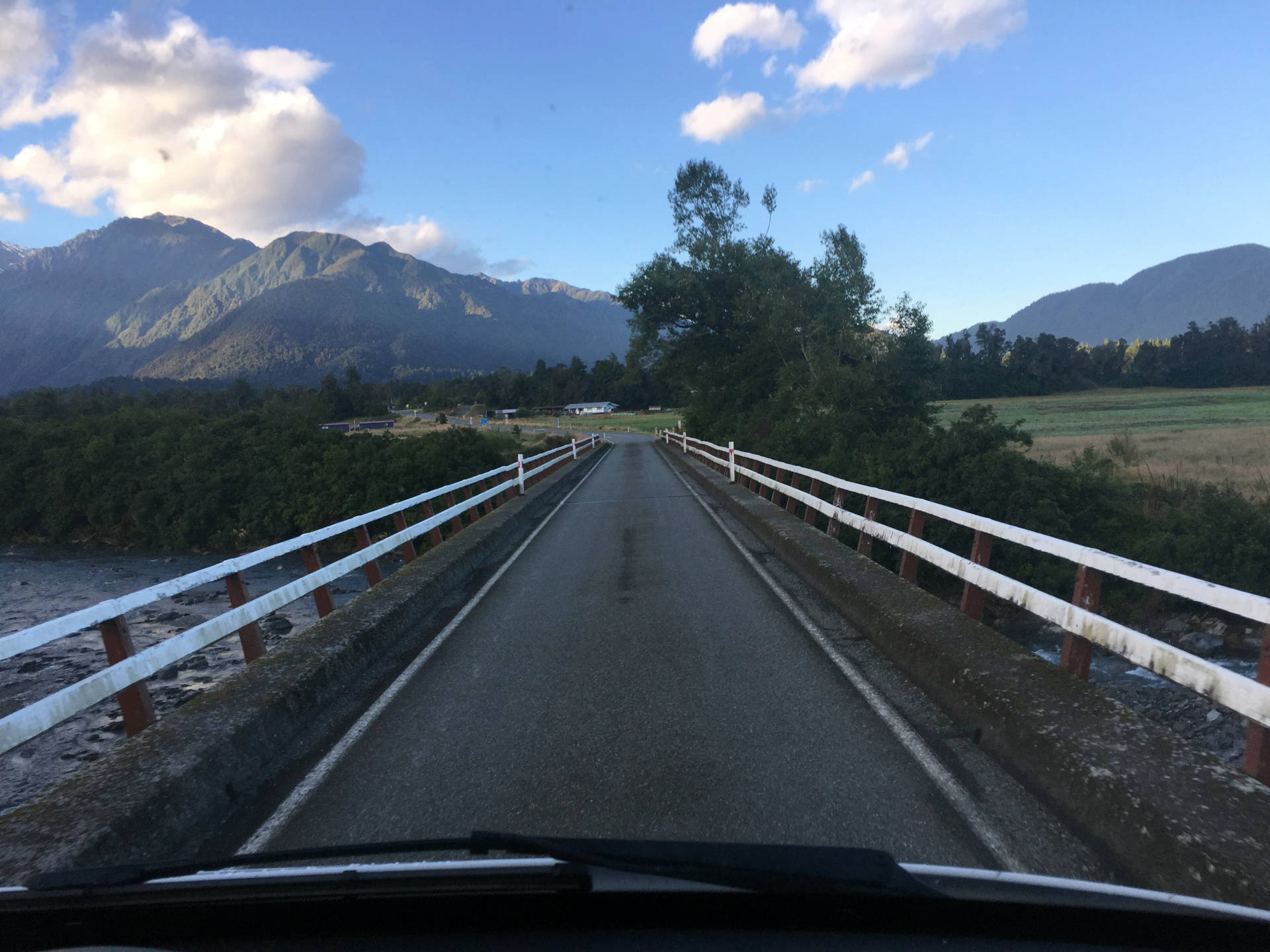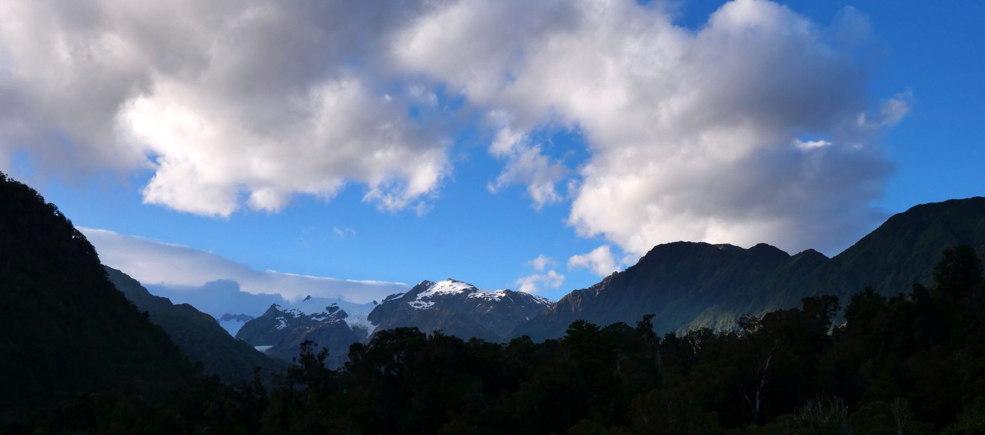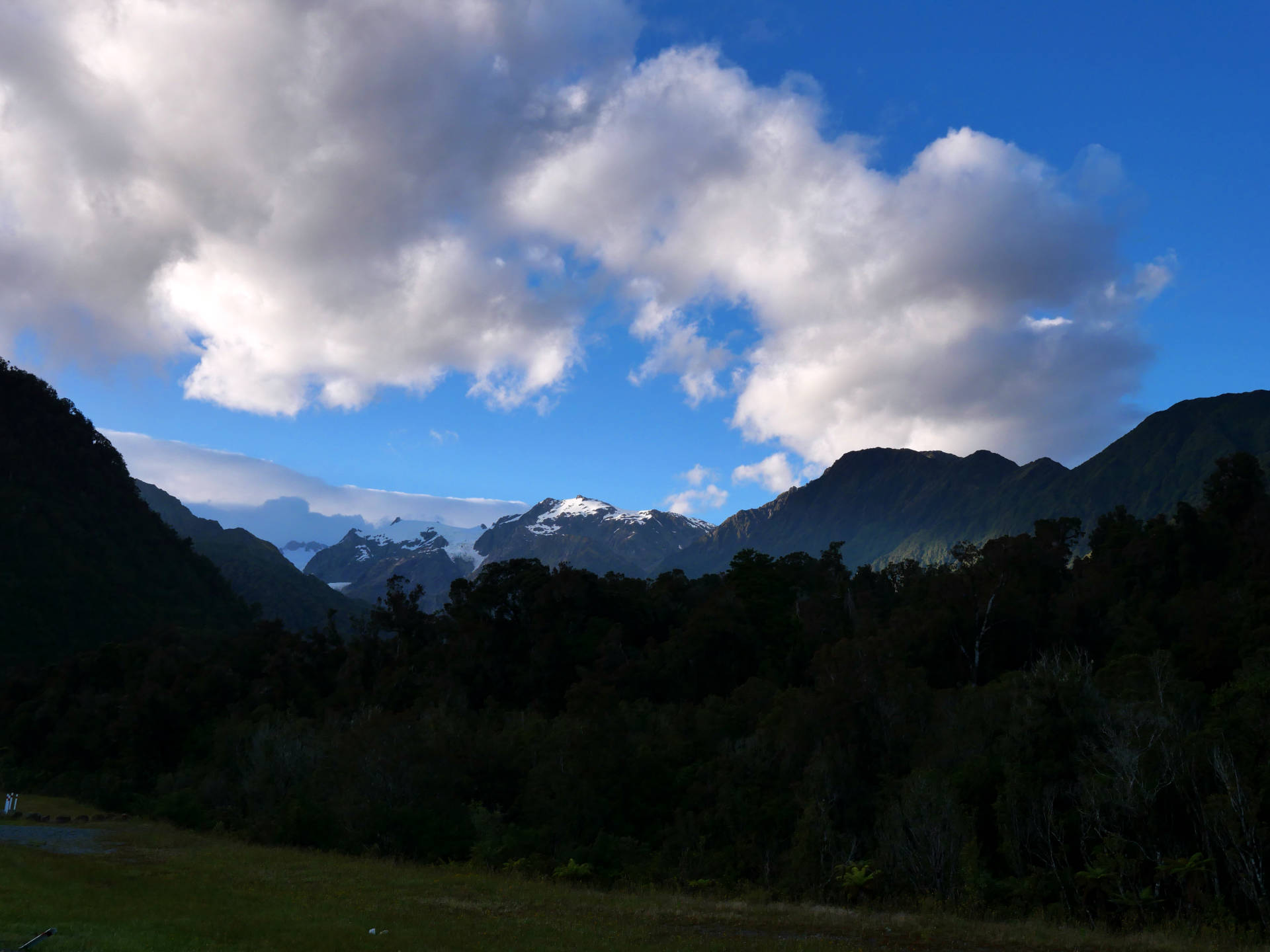 Kurz hinter Hokitika führt der Highway 6 ein wenig weg von der Küste ins Inland. Kulturlandschaft und Wälder wechselten sich ab. Vorbei an kleinen Seen bis es langsam aufwärts ging. Dann waren sie da. Die ersten Schneebedeckten Gipfel tauchten auf und Franz Josef war nicht mehr weit.