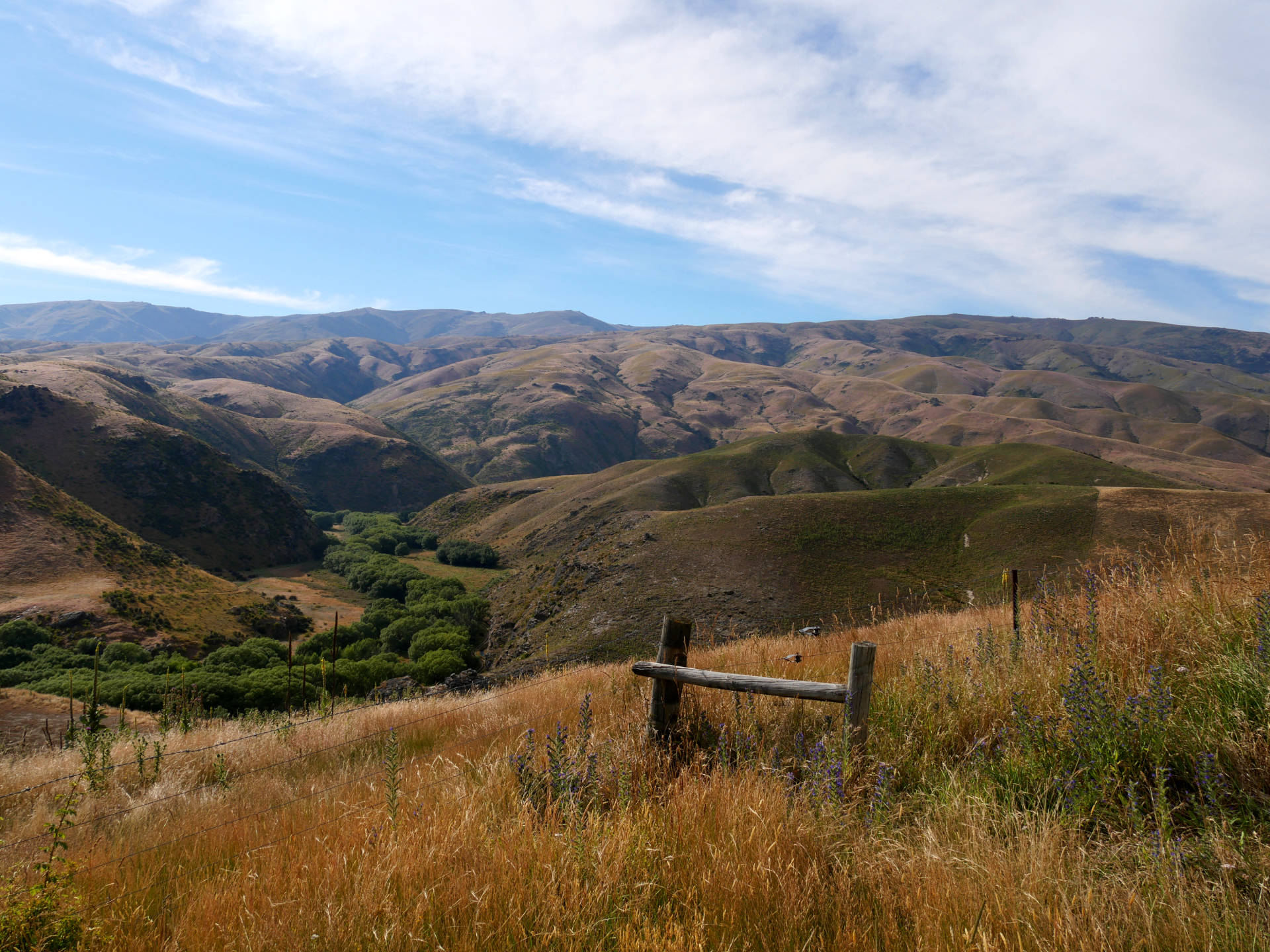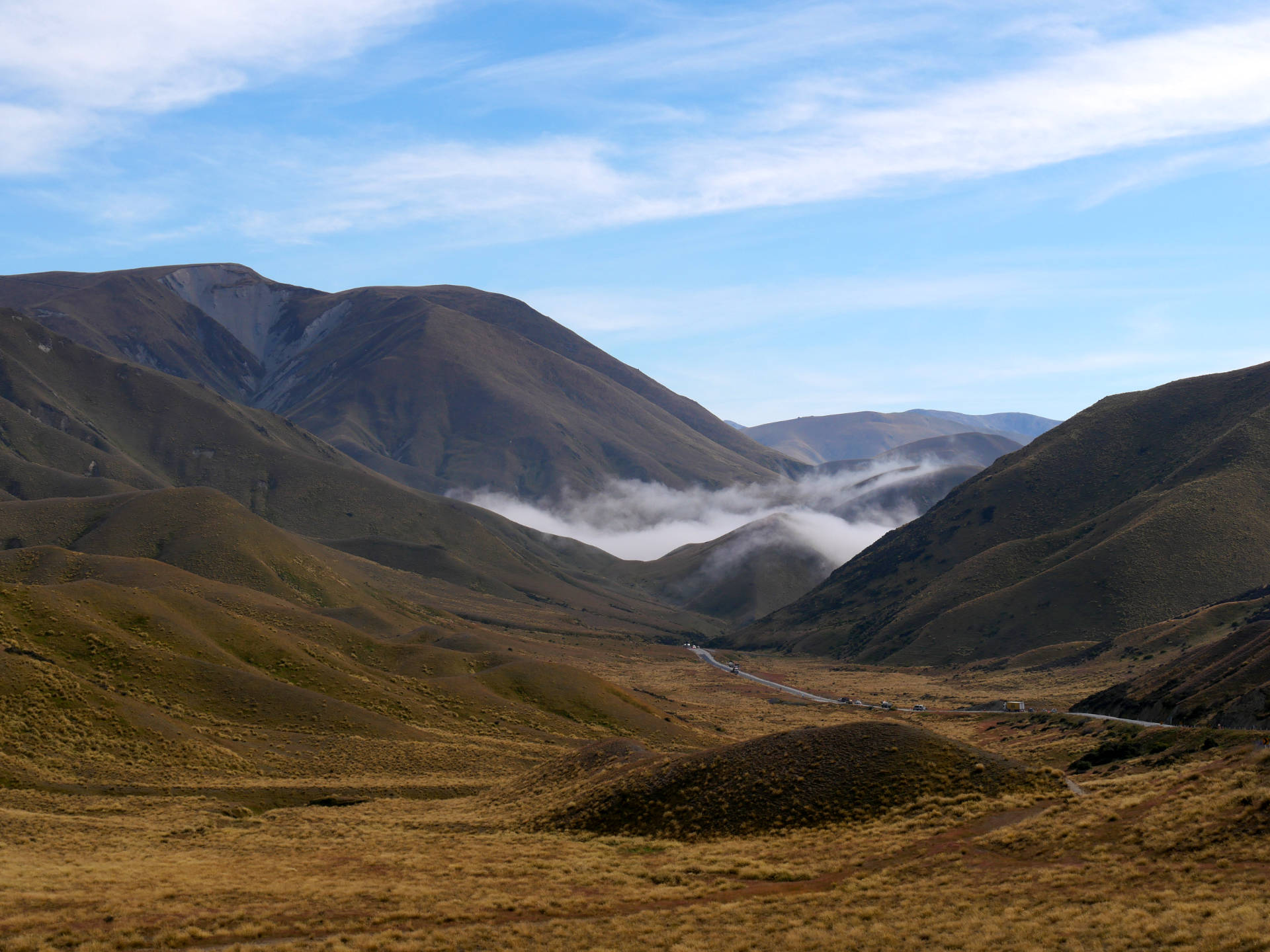 Gut ausgeschlafen und nach einem herrlichen Sonnenaufgang ging es dann los über den Lindis Pass an mein besagtes Ziel. Gebirgige Steppenlandschaft, endlos lange Straßen, gemäßigte Steigungen und bunte grüne Farbtupfer waren das Landschaftsbild. Wenn die grünen Tupfer der automatisiert bewässerten Felder der Farmer nicht währen, so könnte man meinen, man wäre im Hochland von Tibet unterwegs. Die Landschaft soll sich in den letzten Jahren verändert haben, so erzählten mir Einheimische. Immer mehr Flächen werden bewirtschaftet und müssen dazu zu mit riesigen Mengen an Wasser versorgt werden, denn an der Ostseite der Alpen gibt es kaum Niederschlag.