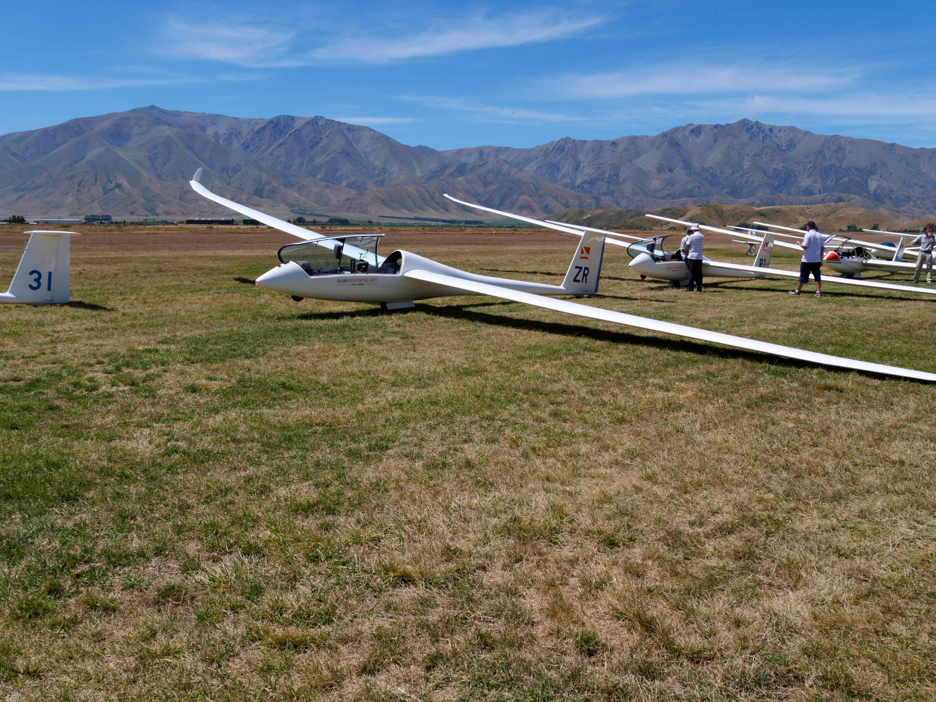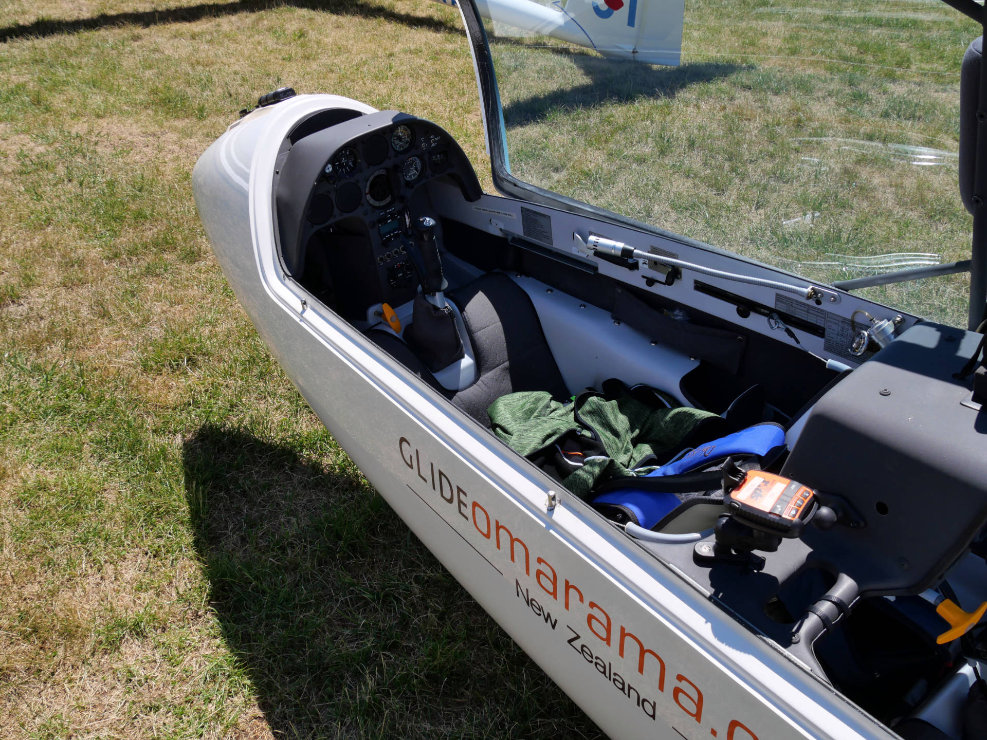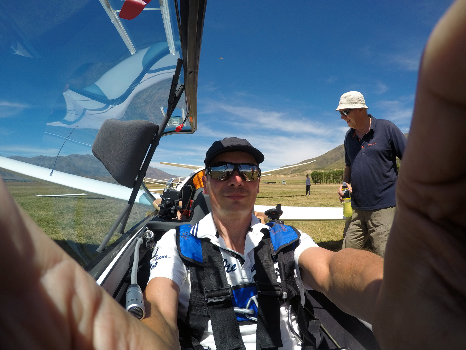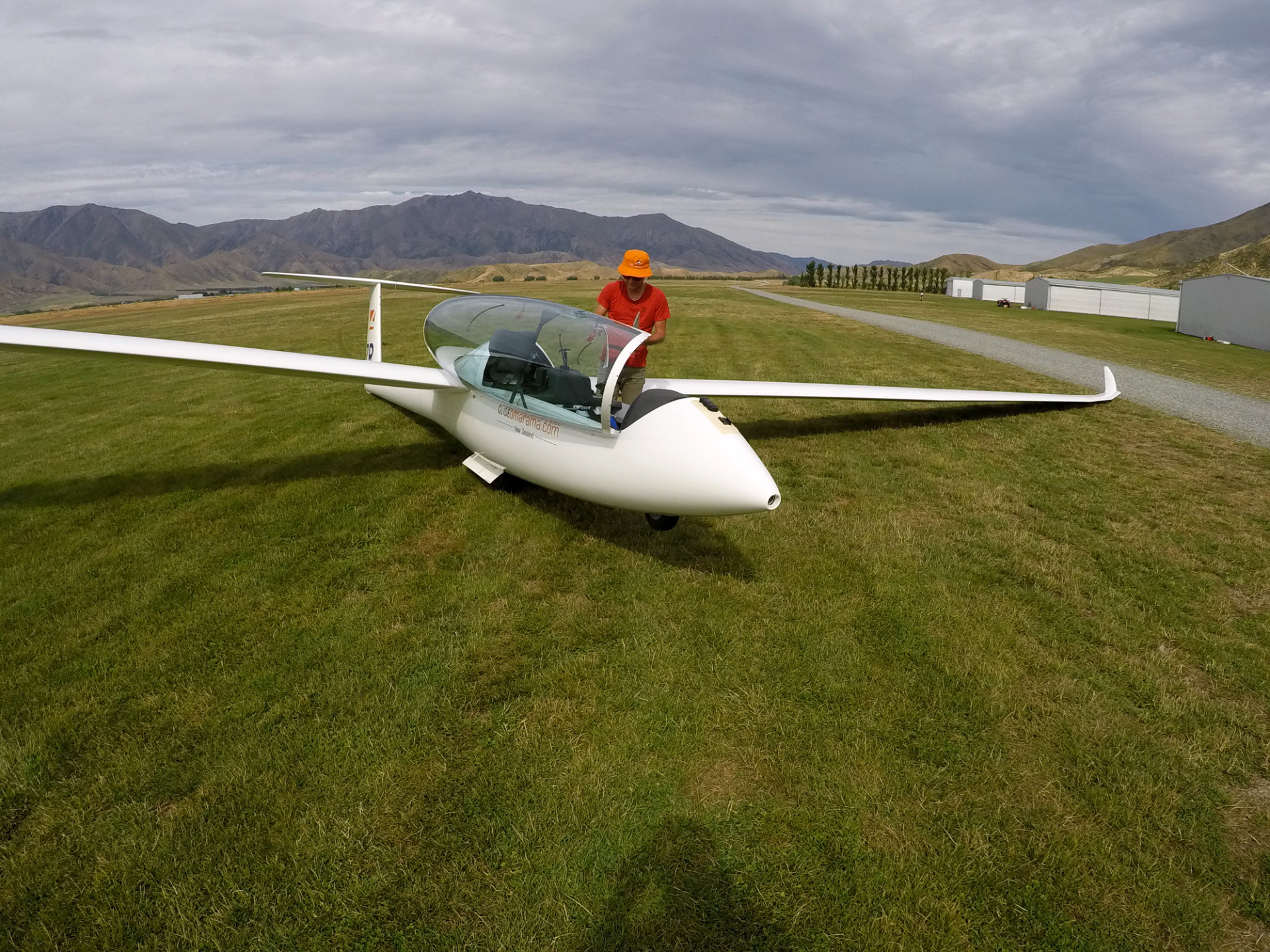 Pünktlich um 13:30 Uhr war ich wieder im Office und da war dann auch mein Pilot Norbert aus Rumänien, der den Sommer über hier in Neuseeland arbeitet. Sofort ging es los zum Rollfeld um die Vorbereitungen zu treffen. Flieger herrichten in Position schieben und Briefing. Rettungsfallschirm, Ablauf des Notausstiegs,  Funkkanal bei Start und Landung sowie in der Luft, Fahrwerksbedienung, Instrumente und noch so vieles mehr. Der Duo Discus Hochleistungssegler, der Firma Schempp-Hirth aus Kirchheim unter Teck bei Stuttgart, soll nun für die nächsten 2,5 Std mein anderer Weg über die Alpen werden.