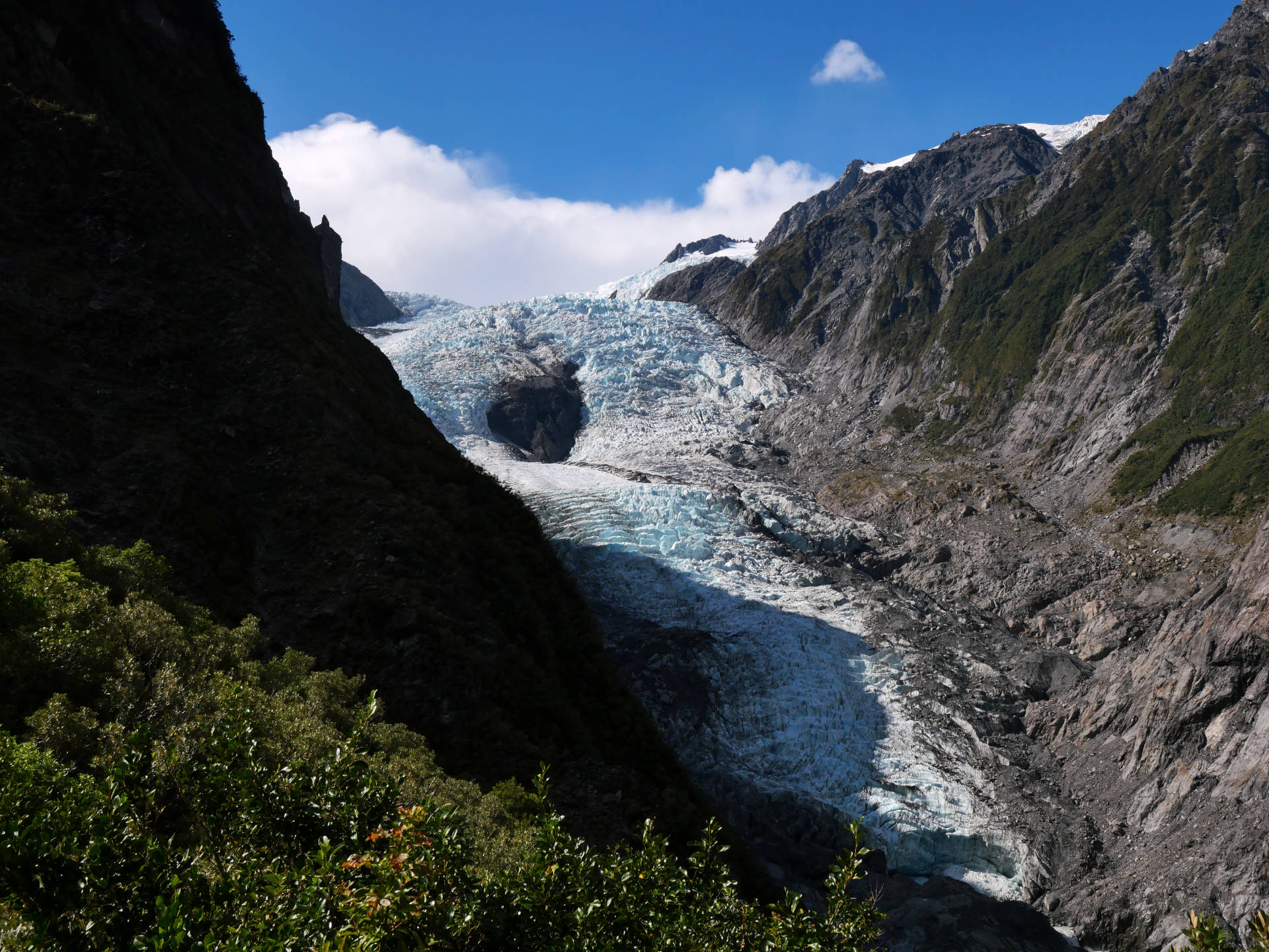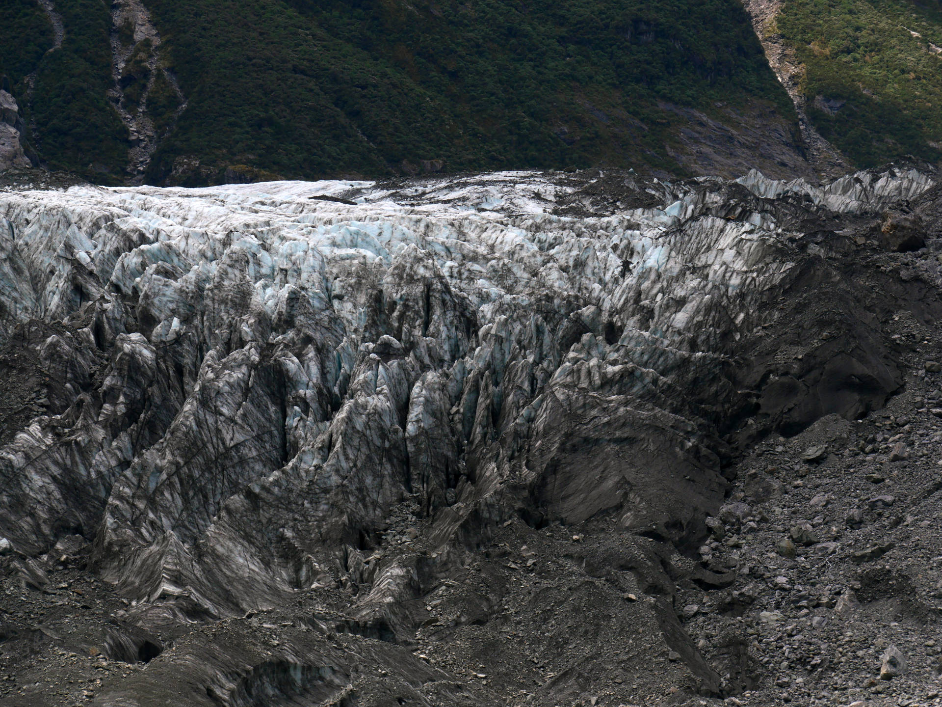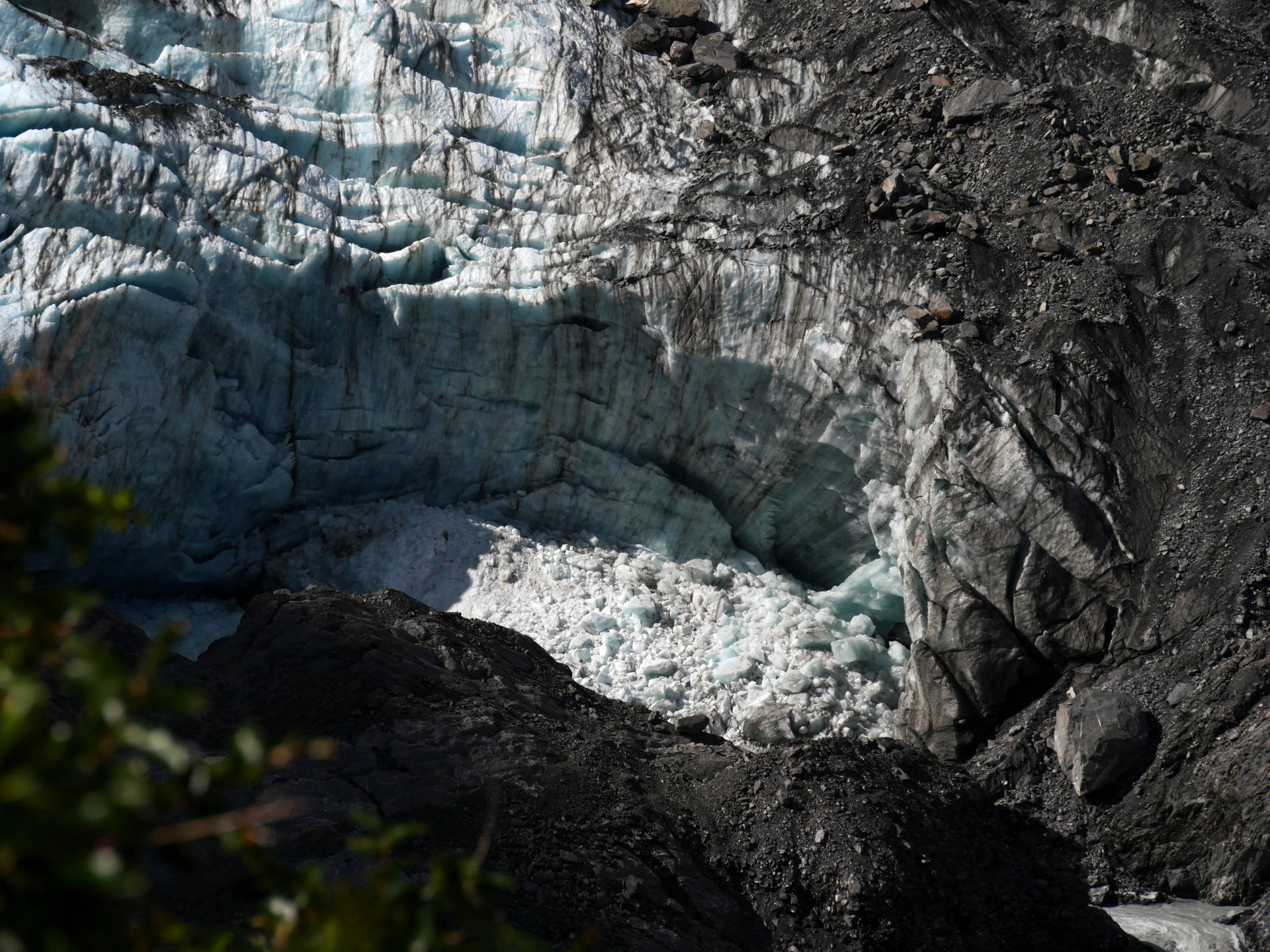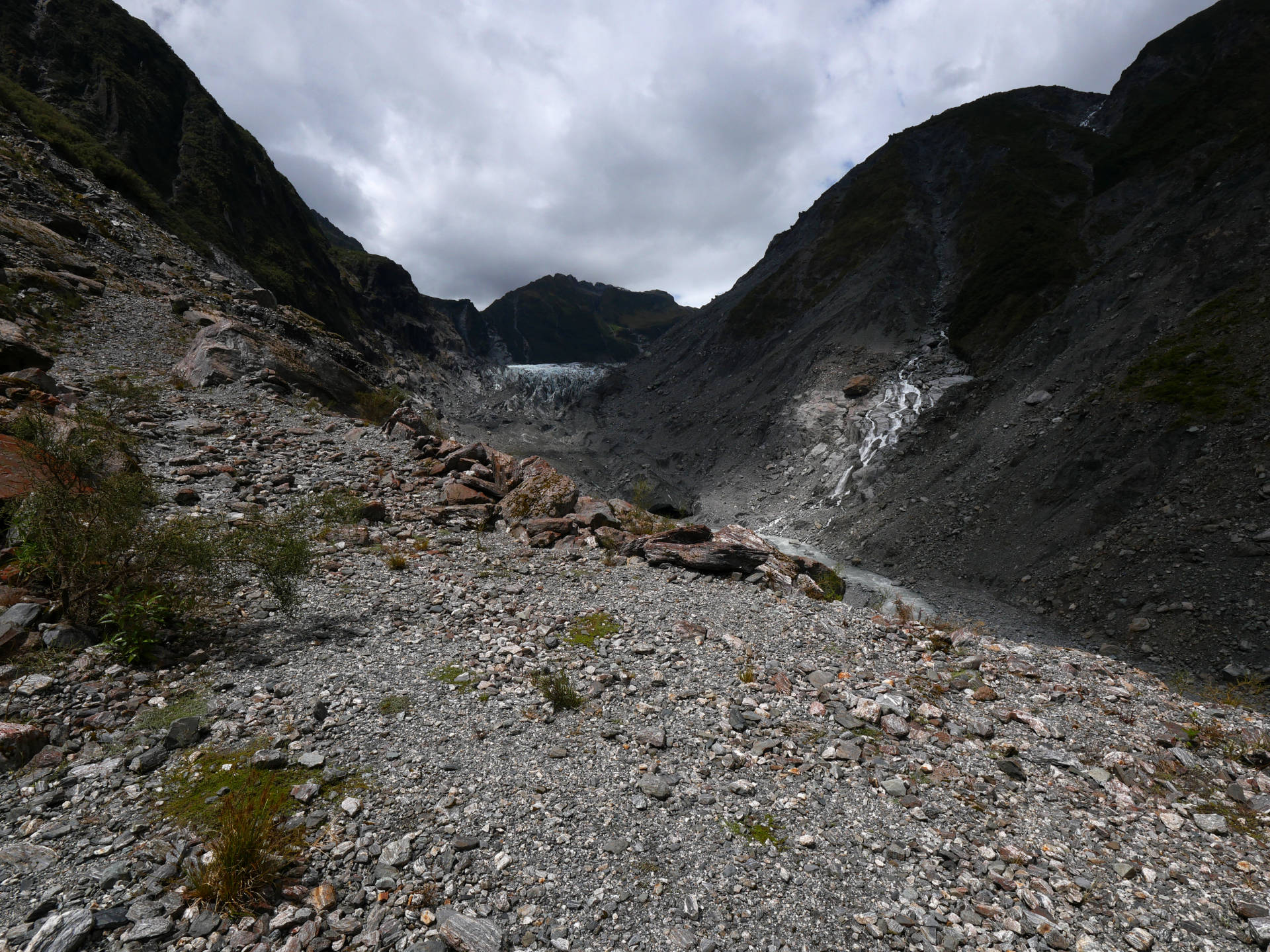 Am Nachmittag besuchte ich noch den Fox-Gletscher, der nur 30 min Fahrzeit entfernt liegt. Dort wanderte ich aber nur auf direktem Weg zum Gletschertor. Zumindest soweit man heran durfte. Hier viel mir der Gletscherschwund am deutlichsten auf, denn auch die Gletscher Neuseelands sind von der Globalen Erwärmung betroffen.