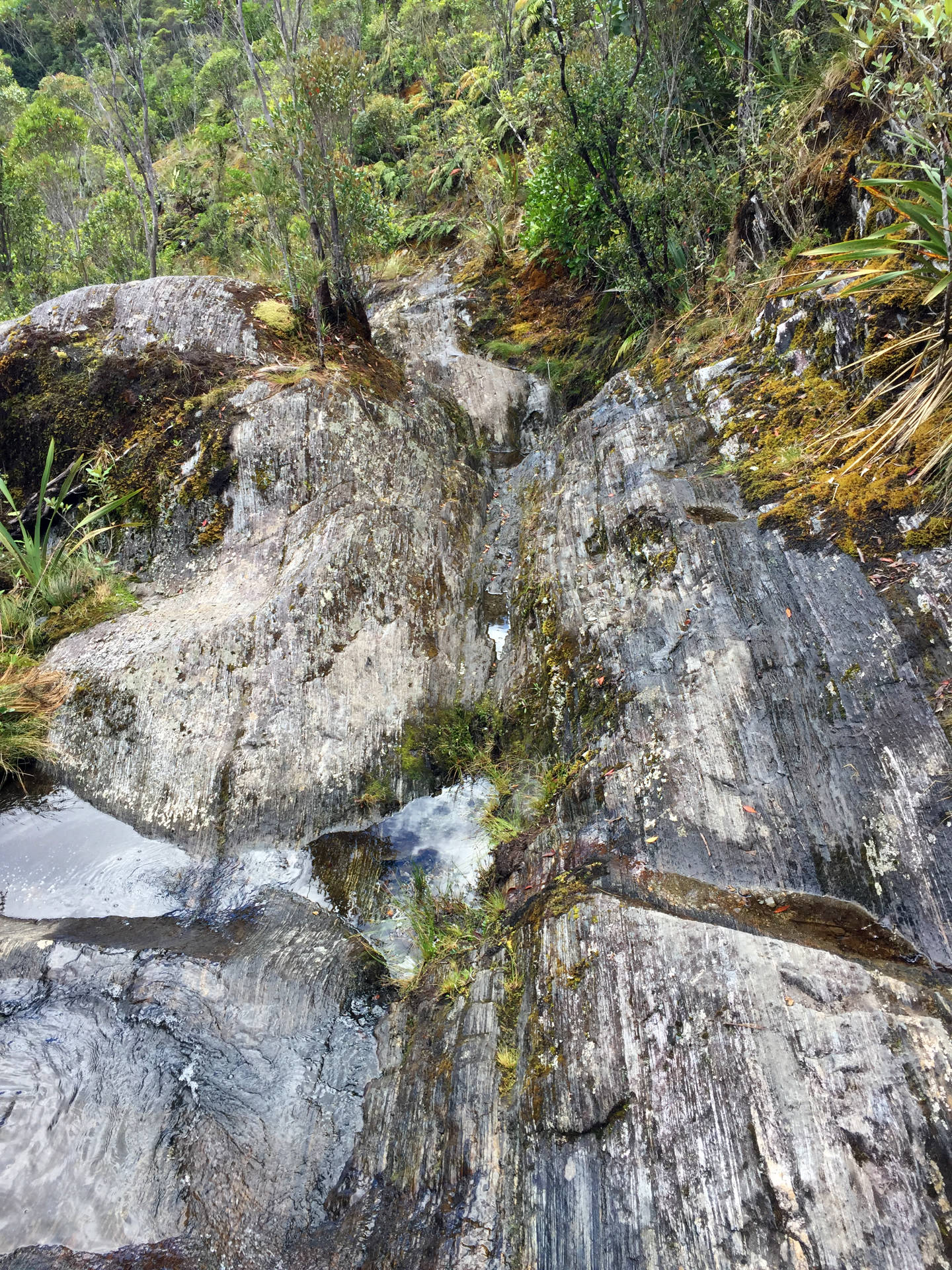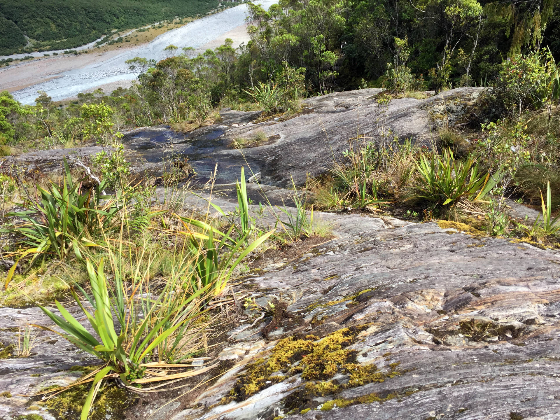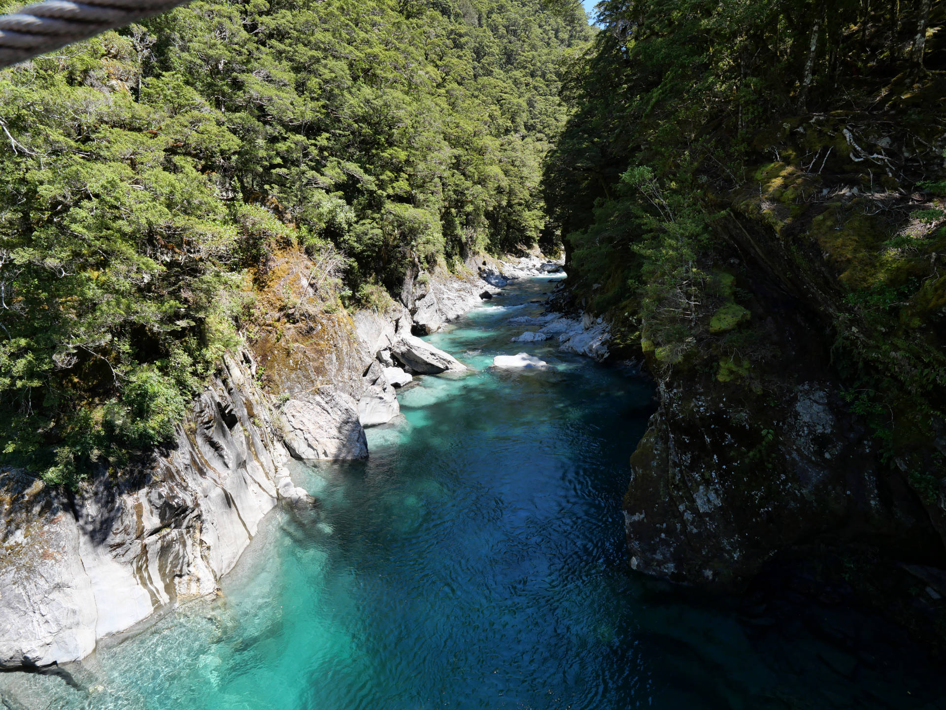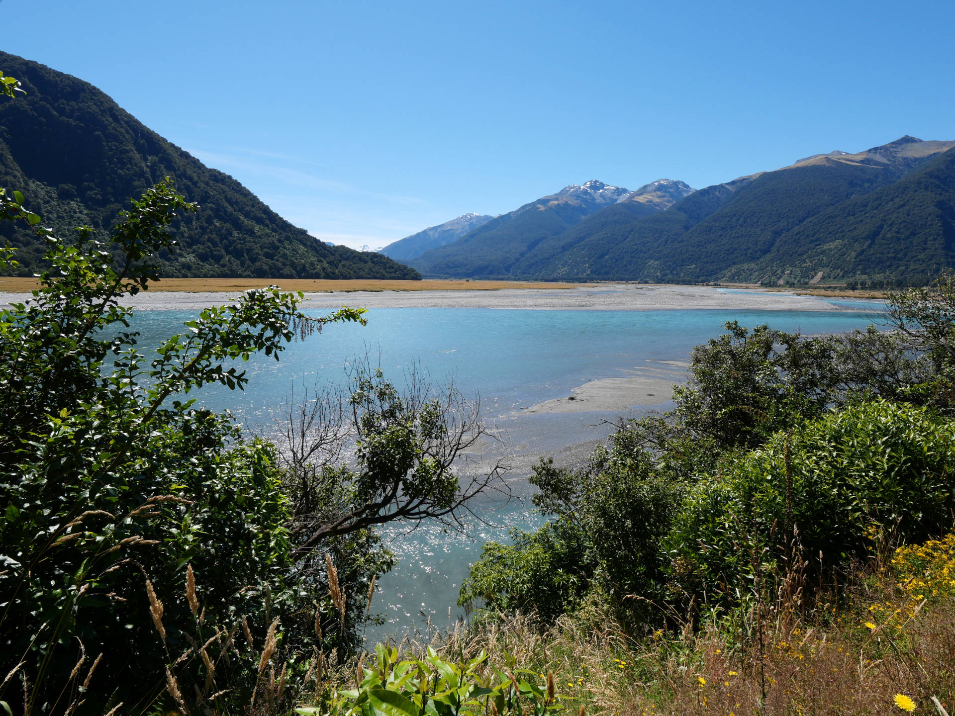 Von Haast aus ging es dann immer am Haast-River hinauf zum Haast-Pass. Ein mächtiger Fluß in einem riesigen Flussbett aus Schotter. Langsam und stetig geht umgeben von einem Wahnsinns Panorama hoch zum Pass. Nur Wald, Berge, der Fluß und keinerlei Bewirtschaftung der Landschaft. Je höher man kam, je mehr übernahmen die Vögel wieder das Sagen im Wald. Zikaden waren nur noch wenige zu hören. Wasserfälle gab es reihenweise und sie sind schon fast nichts besonderes mehr. Es gibt sie überall.