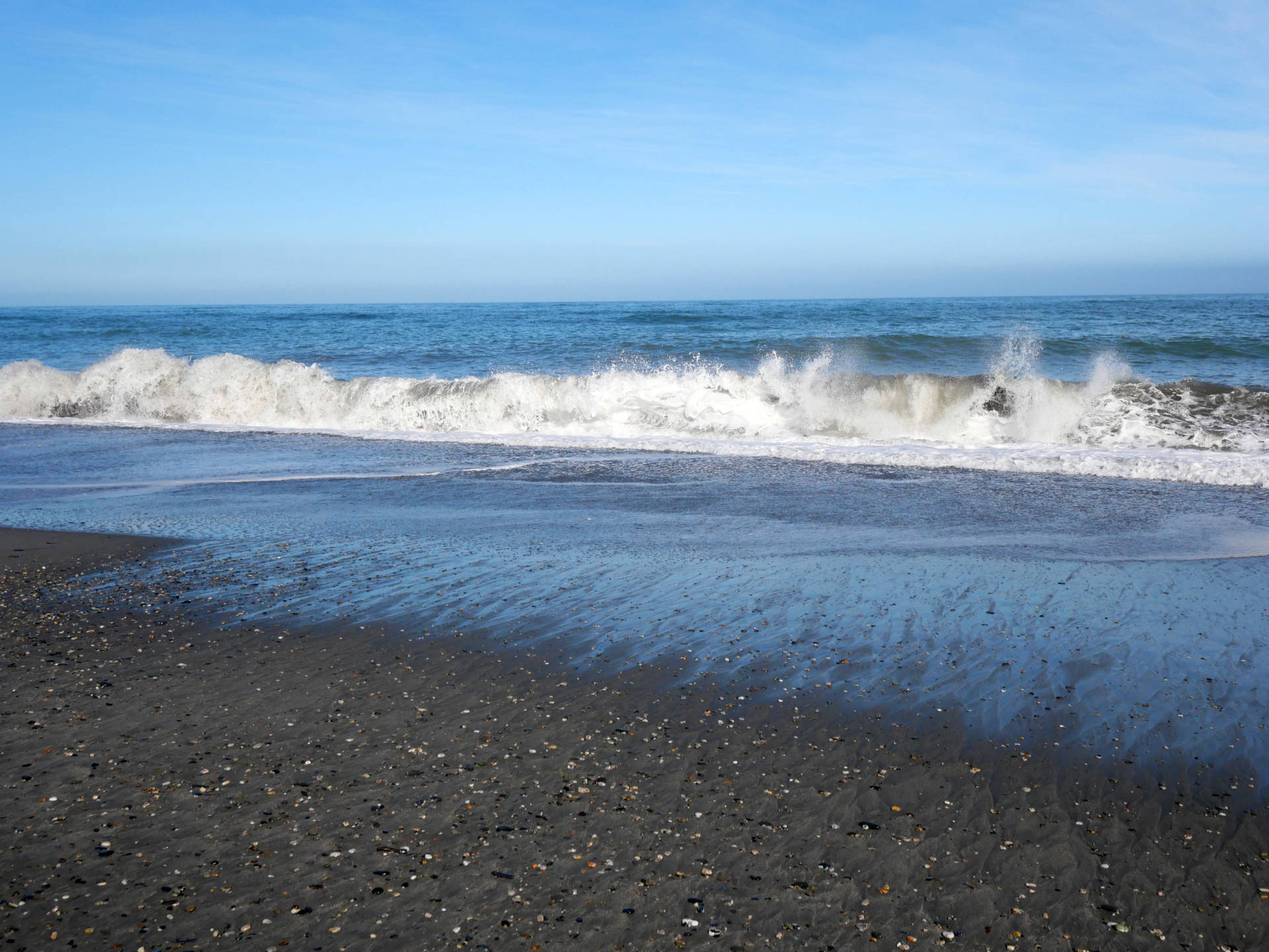 Kurz vor Haast führt die Straße wieder an die Küste zurück und da konnte ich mir das Zikaden-Schauspiel live am Knights Point anschauen. Überall in den Büschen auf den Geländern saßen sie und zirpten und knackten vor sich hin. Allerdings gab es hier auch Unmengen von den Draculas des Dschungels an der Westküste. Sanflies ohne Ende und sie hauten ihre Beißwerkzeuge unbetäubt ins Fleisch. Selbst mein Anti-Brumm hat sie einen feuchten Kehricht interessiert. So verließ ich den Platz fluchtartig und hoffte das es am Ship Creek besser wird. Mit einer zweiten Schicht Anti-Bumm und einem langen Oberteil ging es dann auch und ich genoß noch ein paar Momente am Strand der Westküste.