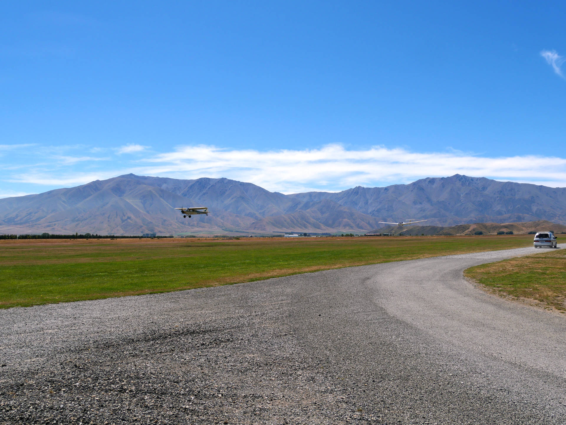 Nun dämmert es sicherlich schon einigen 😉  Ich äußerte einer netten Dame im Office meinen Wunsch vorauf sie sagte, dass ist das kurz klären müsste. Sie kam kurze Zeit später wieder und sagte „Ja, es ist möglich. Es könnte um 14 Uhr los gehen“. „Of course“, sagte ich und plötzlich wurde ich ganz aufgeregt. Nun noch die Formalitäten erledigen und dann hieß es warten. Eine Stunde später hörte man schon das erste Propellerflugzeug und ich machte mich auf zur Startbahn. Der Himmel riss auf und die Vorbereitungen liefen an. Ich war nicht der einzige wartende hier und so tat man sich zusammen und unterhielt sich. Ein Pärchen aus Holland war hier und einen Mutter mit ihrem Sohn aus Christchurch, der hier mit seinen 14 Jahren zur Ausbildung ist und gleich abheben sollte. Die Zeit verging wie im Fluge und als mein Zeitpunkt nahte kam auch eine gewisse Nervosität auf.