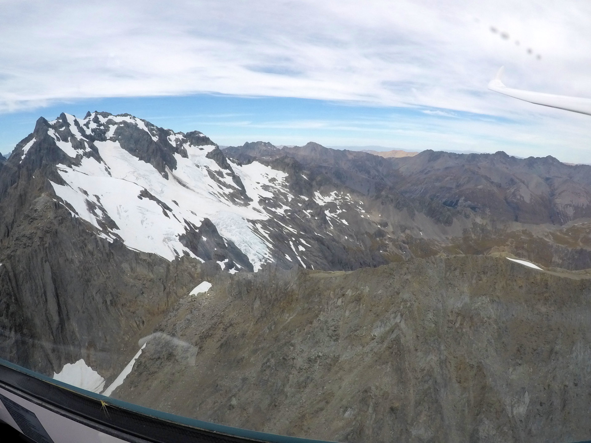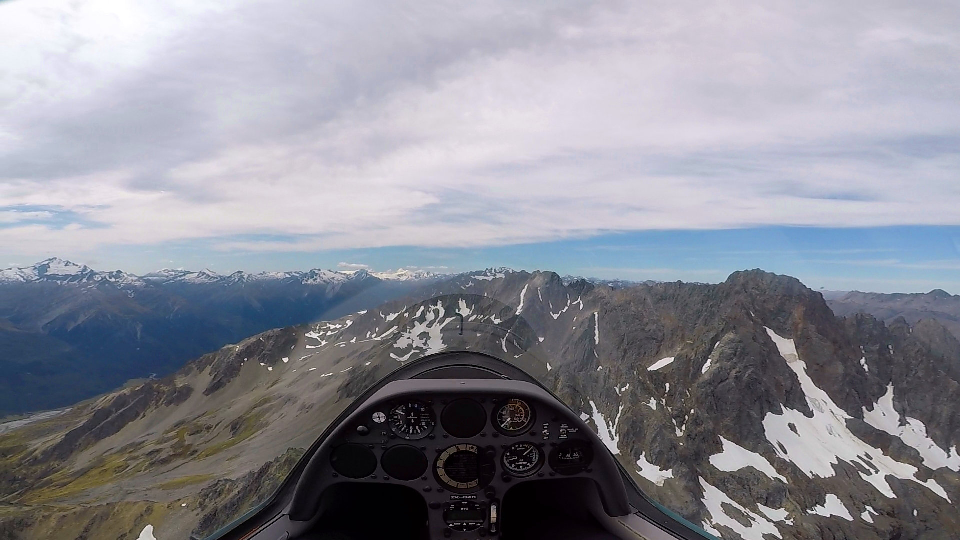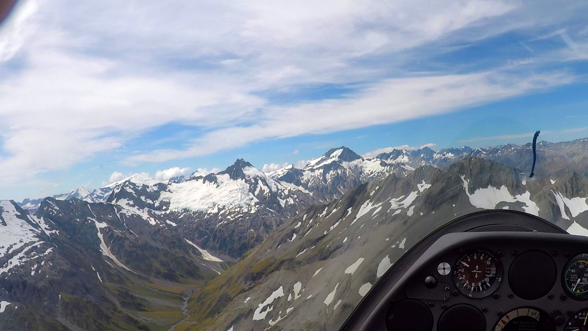 So ging es im Gleitflug von Bergkette zu Bergkette, am Hang entlang, die Aufwinde nutzen um vielleicht den Mount Cook zu erreichen. Atemberaubend, die Berge zum greifen nah an den wir vorbei glitten. Nur getragen vom Wind, der es zu diesem Zeitpunkt gut mit uns meinte und wir im Gleitflug kaum Höhe verloren. Nun mussten wir wieder ein etwas breiteres Tal überqueren um am nächsten Hang wieder den Aufwind nutzen zu können. Leider spielte nun der Wind nicht mehr so gut mit. Wir suchten, fanden aber nichts passendes. So ging es dann doch langsam zurück, da wir sonst über die Zeit kommen würden. Der Rückweg war unerwartet mühselig und wir versuchten immer wieder einen Lift zu finden, der uns noch in die entsprechende Höhe bringt damit wir sicher auf dem Airfield landen können. Es half nichts, wir mussten weiter. Das kreisen an den Hängen reichte nicht aus. Notfalls erklärte mir Norbert, können wir hier fast überall landen. Alles Flach, kein Problem;)