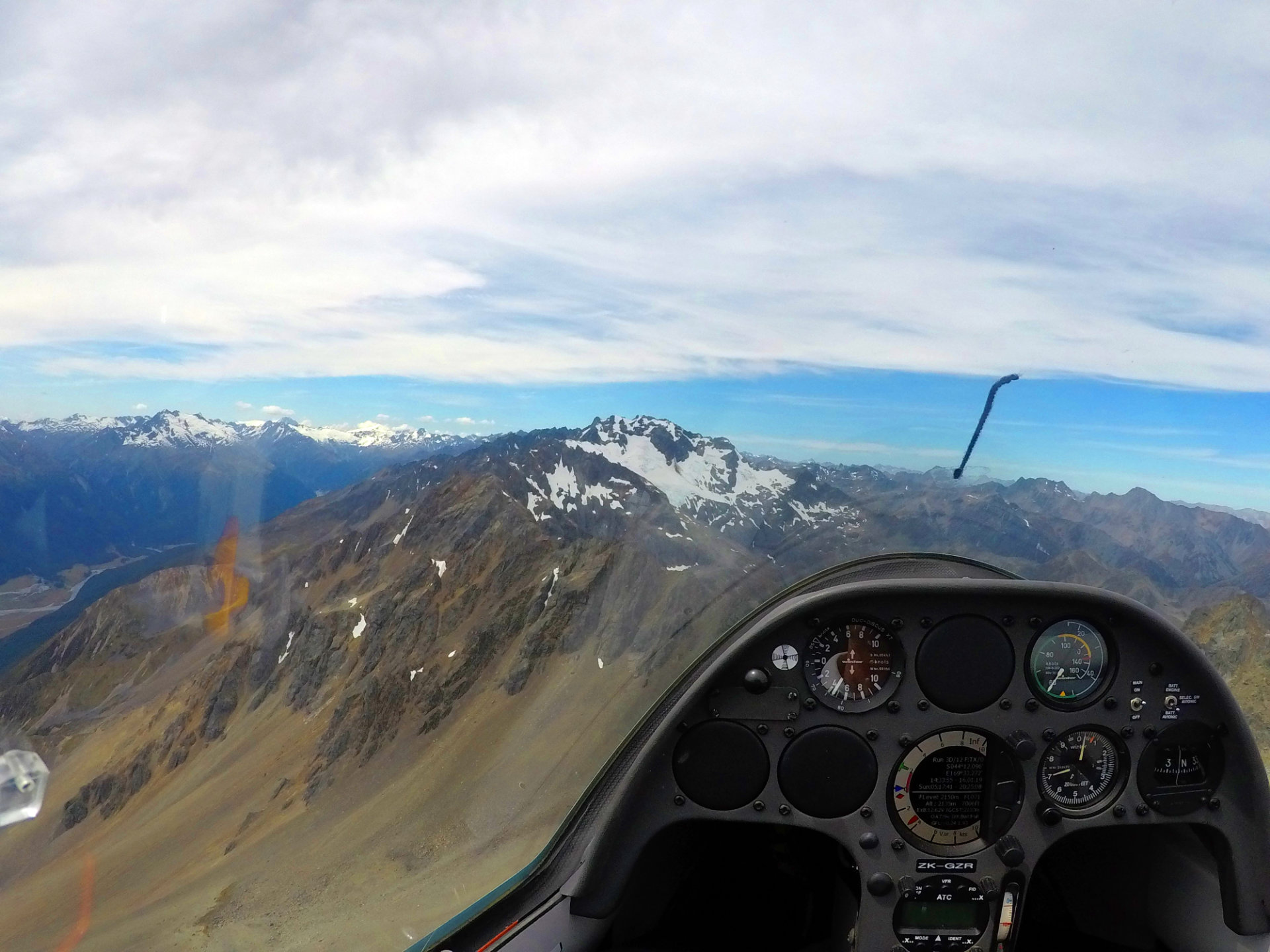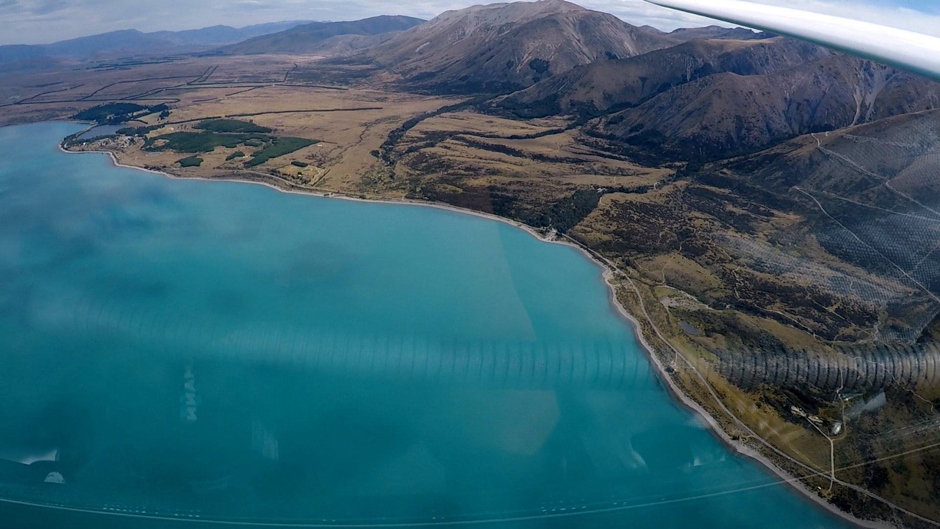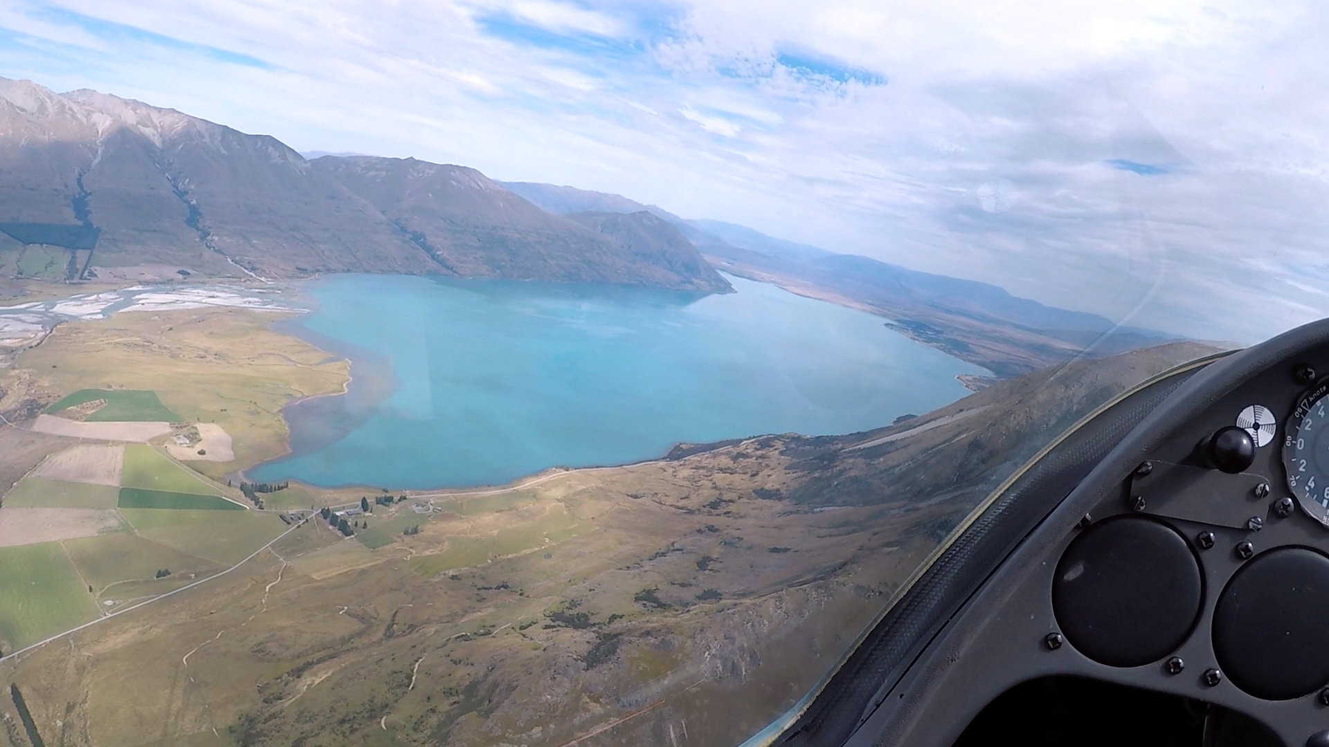 So zogen wir über den Lake Ohau, der uns etwas Aufwind bescherte. Aber dennoch nicht genug. 200m über dem Grund und die Basis noch 17 km entfernt. Also ein Lift muss her und wenn er noch so schwach ist. Da war einer mit 1m/sec und in endlosen Kreisen kamen wir wieder auf entsprechende Höhe. Wieder am gleiten sagte mir Norbert dann, ich sollte doch übernehmen! Ok, warum nicht. Steuerknüppel in die Hand und mit Gefühl den Glider geflogen. Was soll ich sagen… ein irres Gefühl. Rauf, runter, links, rechts und eine Runde übers Airfield. Jetzt könnte ich noch länger oben bleiben, wenn da nich das Thema mit der Höhe erreichen wäre. Nun war mir aber klar, warum Norbert noch etwas mehr Höhe erreichen wollte.