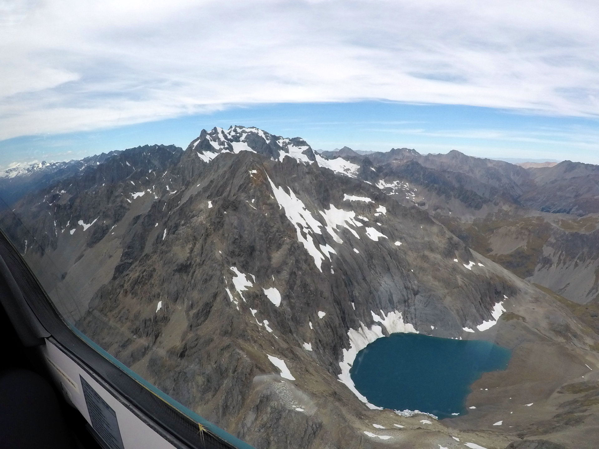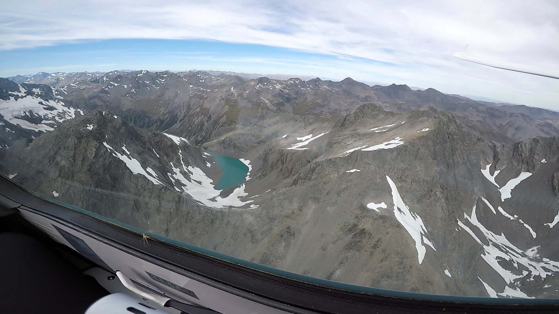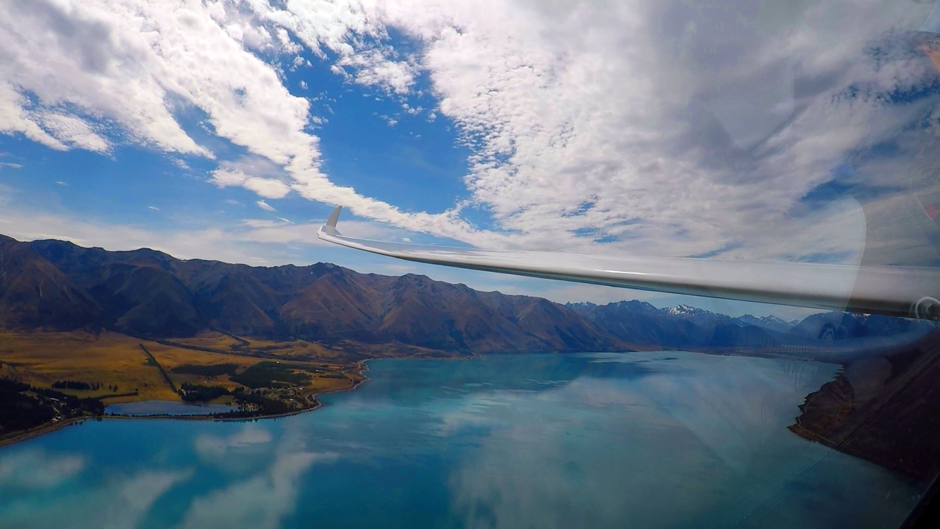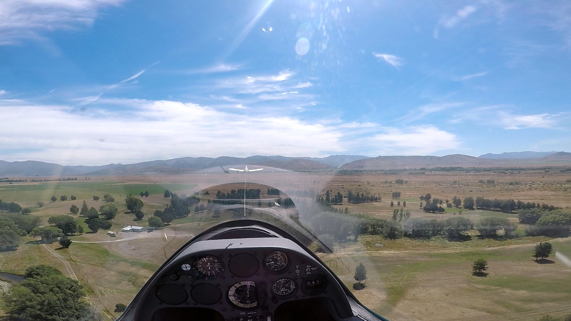 So zogen wir über den Lake Ohau, der uns etwas Aufwind bescherte. Aber dennoch nicht genug. 200m über dem Grund und die Basis noch 17 km entfernt. Also ein Lift muss her und wenn er noch so schwach ist. Da war einer mit 1m/sec und in endlosen Kreisen kamen wir wieder auf entsprechende Höhe. Wieder am gleiten sagte mir Norbert dann, ich sollte doch übernehmen! Ok, warum nicht. Steuerknüppel in die Hand und mit Gefühl den Glider geflogen. Was soll ich sagen… ein irres Gefühl. Rauf, runter, links, rechts und eine Runde übers Airfield. Jetzt könnte ich noch länger oben bleiben, wenn da nich das Thema mit der Höhe erreichen wäre. Nun war mir aber klar, warum Norbert noch etwas mehr Höhe erreichen wollte.