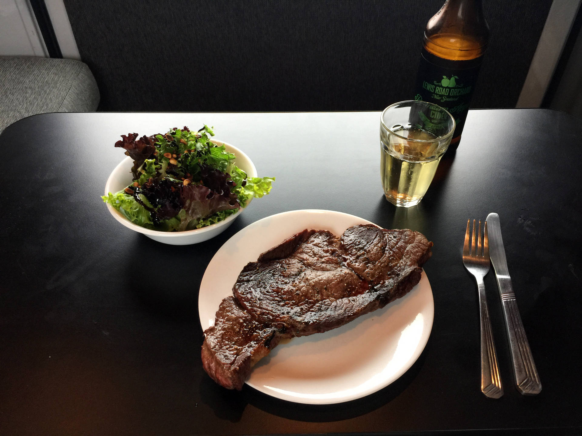 Ich war alleine hier. Die letzten Scharfe die ich sah waren ca. 2km entfernt. Draußen nichts außer Wolken, der Camper schaukelte, es prasselte von allen Seiten und aus den Schränke sog es wie Hechtsuppe (starke Zugluft). Es wurde schnell kalt im Camper und ich musste einheizen. Also gemütlich machen und gut Essen. Ich hatte vorgesorgt und mir ein kleines 520g Steak besorgt. Kirschen hatte ich auch noch und so gab es ein leckeres Menu am Abend.