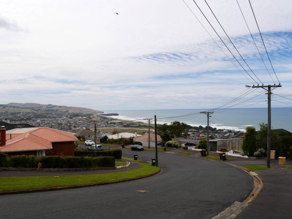 Nun war es Zeit die Badelatschen sauber zu laufen. Die beiden aus Dunedin, die ich in Glenorchy traf, hatten mir die Tunnel Beach empfohlen. Das ist genau das Richtige. So verließ ich Dunedin über die südlichen Wohnbezirke mit Richtung Steilküste. Die lieben Leute hier im Süden von Dunedin wohnen schon Traumhaft! Eine tolle Sicht auf die Stadt und den Pazifik. Musste einfach ein paar Schlenker durch das Wohngebiet machen.