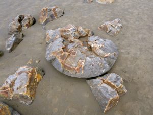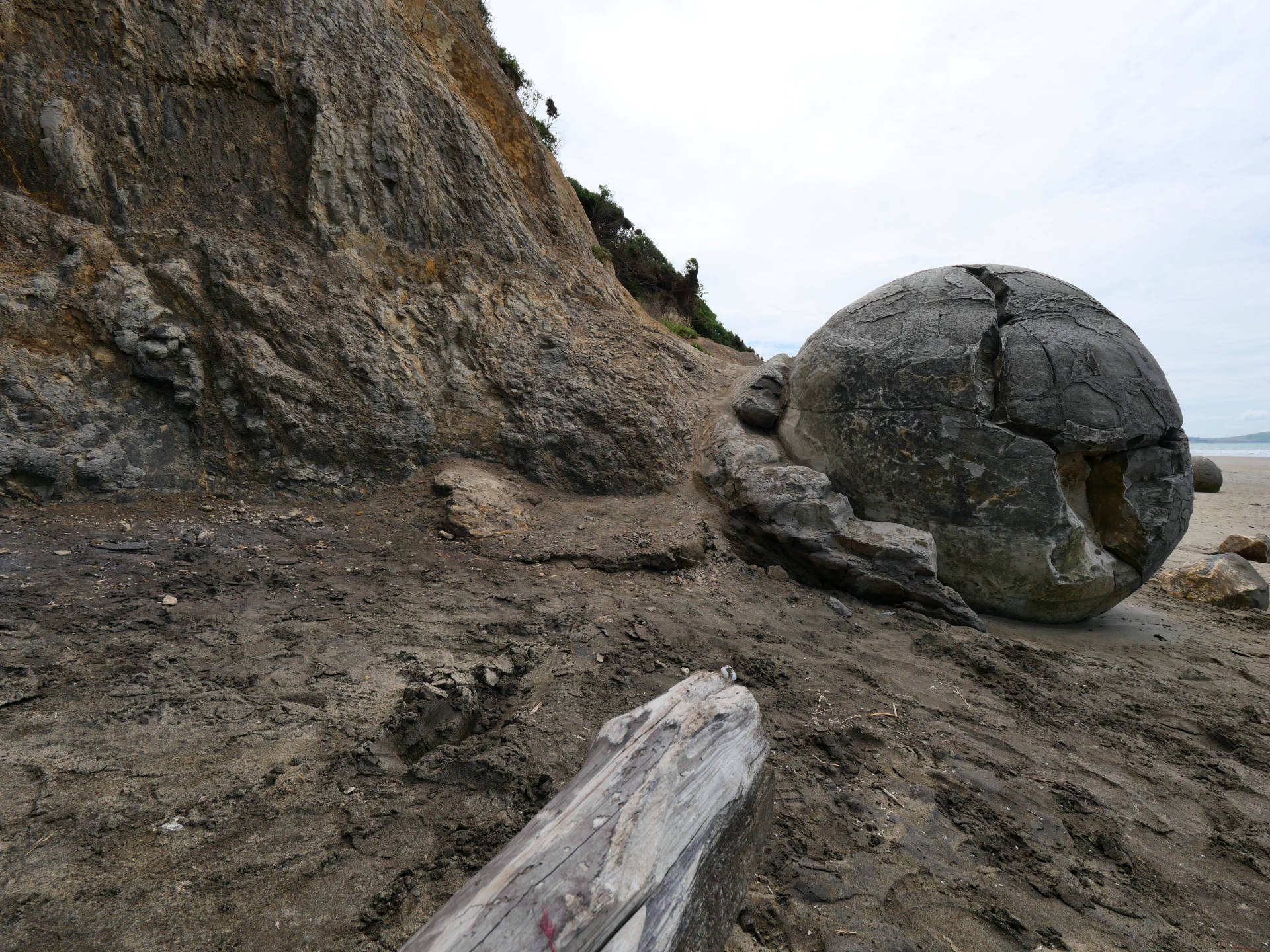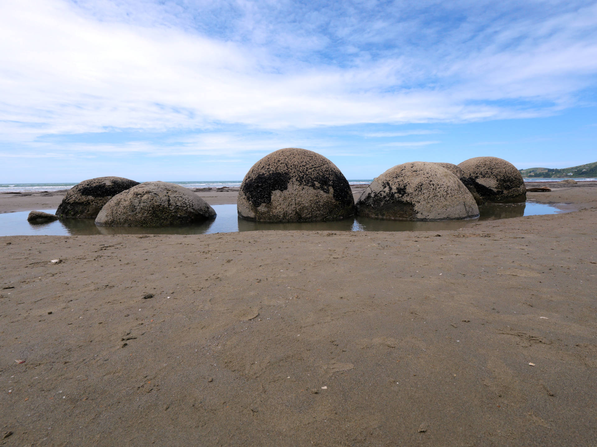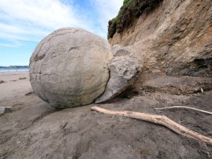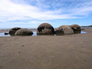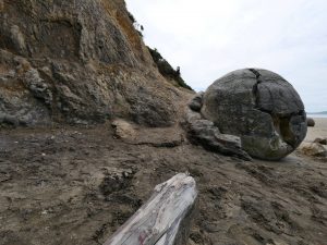 Mein am Morgen geschmiedeter Plan sah nun eine Stadtbesichtigung von Dunedin vor, aber irgendwie hatte ich dazu keine Lust mehr und suchte mir einen Ort zum Übernachten heraus, wo man vielleicht auch noch etwas Natur genießen kann. So fand ich den Moeraki Boulder Kiwi Holiday Park in Hampden, der an einem schönen, langen Strand gelegen ist. Der Holiday Park wird übrigens von einem Schweizer betrieben, der seit 10 Jahren hier in Neuseeland lebt. Es ist ein sehr schöner, ruhiger und gepflegter Platz auf dem ich mich wohlgefühlt habe. Der Inhaber gab mir auch noch einige Tipps, was ich hier noch alles machen könnte. So nahm ich zwei Dinge noch war. Als erstes besuchte ich die Moeraki Boulders, eine Ansammlung von fast kugelförmigen Steinen, die nach und nach aus der Küste herausgewaschen werden und langsam zerfallen. Anschließend ging es zum Tiere beobachten an den Katiki Point. Hier sollte ich Pinguine zu sehen bekommen. Und dich hab zwei gesehen. Allerdings so klein aus der Ferne, das ich ohne mein Teleobjektiv sie nie bemerkt hätte. Dafür gab es weitere Seelöwen, die grade vom Fressen zurück kamen und sich ein Ruheplätzchen gesucht haben.