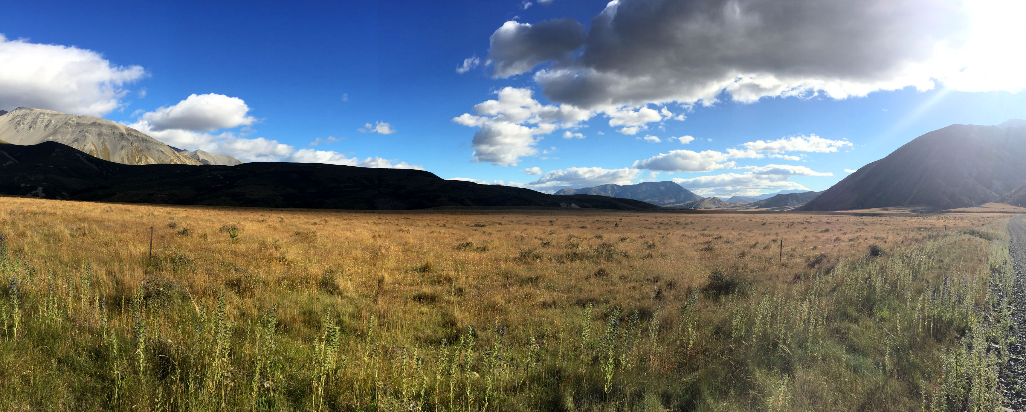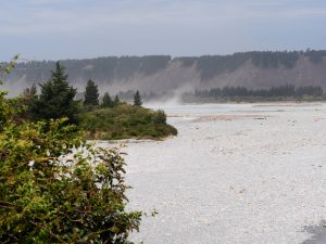 Doch plötzlich  änderte sich die Landschaft schlagartig, wie der Wind der auf einmal einsetzte. Ein extrem heißer Wind von den Bergen. Von weiten sah man schon immer so einen Nebel aufsteigen, den ich aber nicht zuordnen konnte. Nun wusste ich was es war. Kurz hinter Mt. Hutt öffnete sich ein Tal in dem der Rakaia River fließt. Hier war es so trocken und windig, das der fast weiße Sand aus dem Flussbett aufgewirbelt wurde, das er schon von weiten zu sehen war. Hier waren es urplötzlich 28 Grad, wo vorher das Thermometer gerade 20 Grad zeigte!